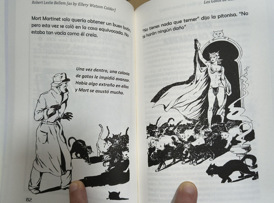 El relato con el que arrancamos «Los colmillos del murciélago» es un claro ejemplo de pastiche pulp inclasificable. No hay forma de etiquetarlo. Y aquí, nuestro amigo Bellem juega con el lector como solo él sabe hacerlo. Horror, diversión y alguna que otra sorpresa bastante retorcida. Y lo mismo podríamos decir de su otra historia, que también adjuntamos «Los gatos de Cassandra», aunque bajo seudónimo, el de Ellery Watson Calder, que según tengo entendido es el que solía usar cuando le tocaba firmar uno de esos trabajillos de escupepalabras, como si de una ametralladora Thompson agujereando el chaleco de algún gánster de pacotilla se tratase; trabajillos en los que se le había ido tanto la olla, que ni el propio Bellem se atrevía a estampar su rúbrica; para eso estaba Ellery, Jerome, o el mismísimo John Wayne, entre otros. Y en el caso que nos ocupa, la tal Casandra nos revelará una entretenida perversión de gatos, mujeres fatales y fulanos buscavidas ¡toma ya!