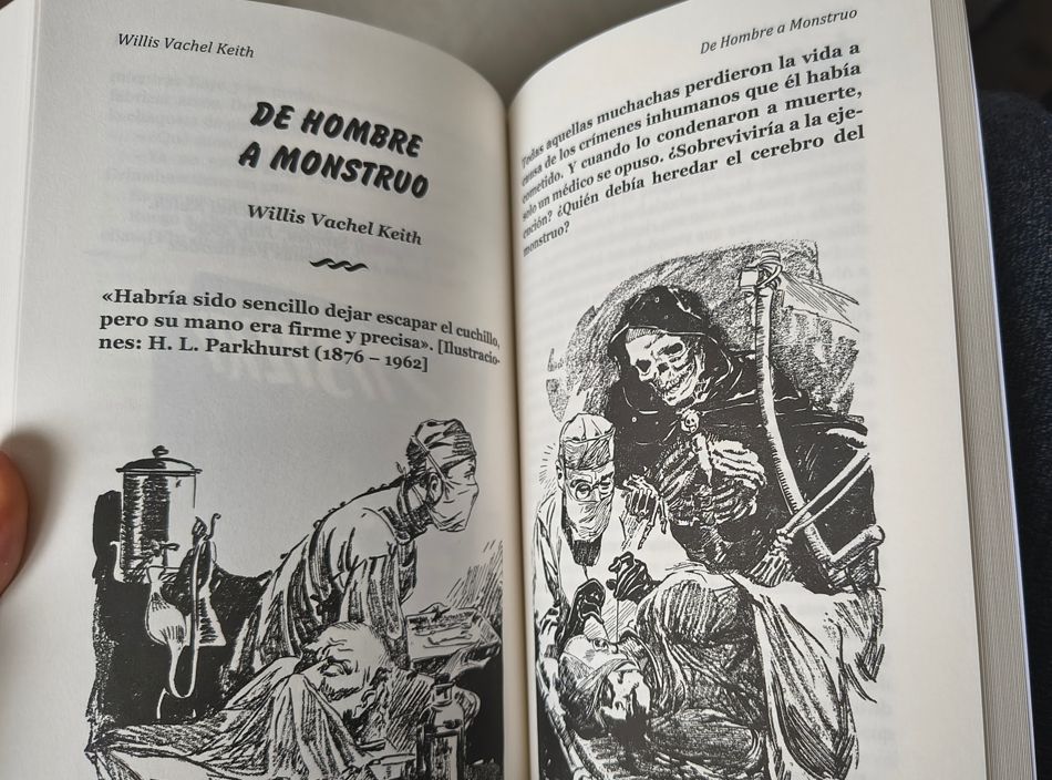 DE HOMBRE A MONSTRUO. «Man Into Monster». Willis Vachel Keith. Spicy Mystery Stories, July 1936. Trad. Emilio José Iglesias Fernández. [El doctor Mark Goethals era un genio de la neurocirujía y su pupilo, el joven Miller, todo un entusiasta. Un día, cuando Alva, el amor platónico de Miller, le pide ayuda, este no podía imaginarse lo que se le venía encima]