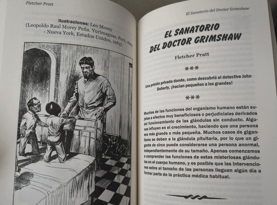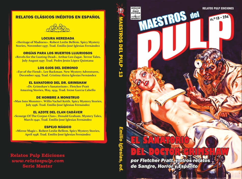 El resto de relatos ―si bien no todos―, en su mayoría pivotan en torno a la mítica figura del mad doctor, pero no el de laboratorio fantástico, sino el de horror y tortura, siguiendo más o menos la línea que habíamos marcado en el número 7 de nuestra colección. Se podría decir que tanto dicho número como este, el 13, son hermanos gemelos. Aquí, uno de los relatos más interesantes es el firmado por Flechet Pratt, un autor que descubrí cuando publicamos, en el número 4, «El ciclo del pulpo». Tan grata fue la impresión que me había dejado que ahora hemos vuelto con él. Su relato, «El sanatorio del doctor Grimshaw», es una interesante narración sobre experimentos macabros, publicada originalmente en Amazing Stories. Obviamente, dada la línea editorial de esa revista, aquí tendremos más pseudociencia que gore.